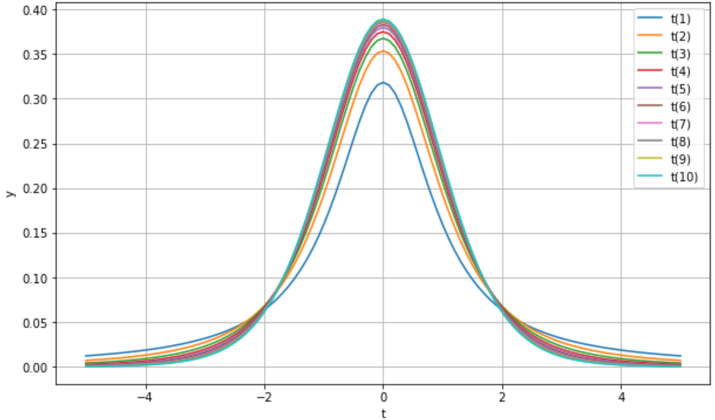 자유도에 따라 t-분포를 그려보면 다음과 같은 결과를 볼 수 있습니다.