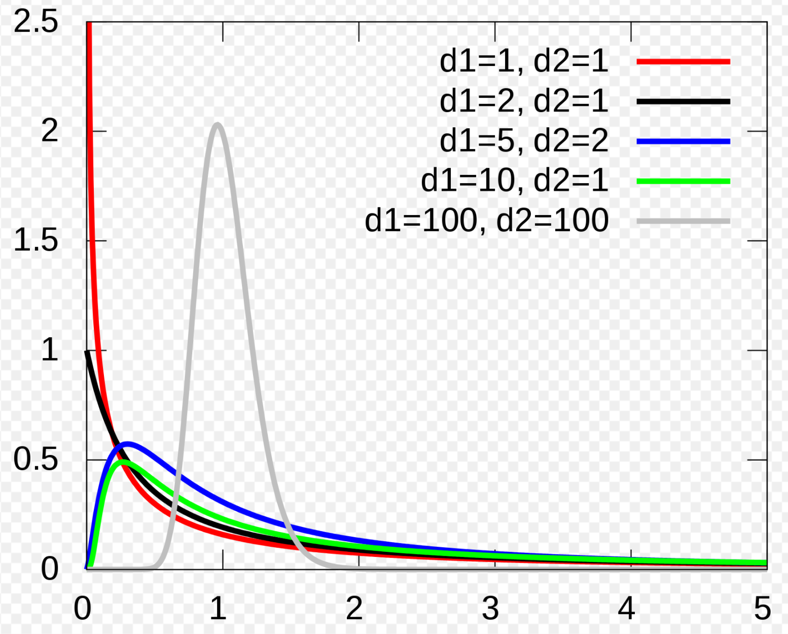 자유도 $k_1, k_2$의 카이제곱 분포를 따르는 두 확률변수 $V_1, V_2$가 존재할 때, 확률변수 $F$는 다음과 같이 정의되며 자유도가 $(k_1, k_2)$인 F-분포를 따른다고 합니다.