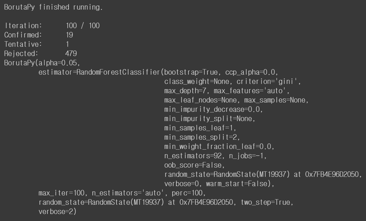 여기서 알 수 있는 부분은 BORUTA는 우리가 남기고자 하는 feature 개수를 선택할 수 없습니다. 알고리즘 특성 상 타겟 변수 설명에 있어 중요하냐/중요하지 않느냐 만 따지기 때문입니다. 또한 모델의 상관없이 사용할 수 있는 알고리즘이지만 feature를 복사하고 랜덤하게 섞고 importance 기반으로 계산하는 과정으로 동작 시간이 굉장히 오래 걸립니다. 또한, 결측된 값이 있을 때 BorutaPy를 동작시키기 전에 무조건 채워주어야 합니다.