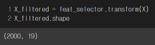 또한, BorutaPy는 scikit-learn api interface를 지원하므로 transform 메소드를 통해 원래 feature에서 선택된 feature만 필터링할 수 있습니다.