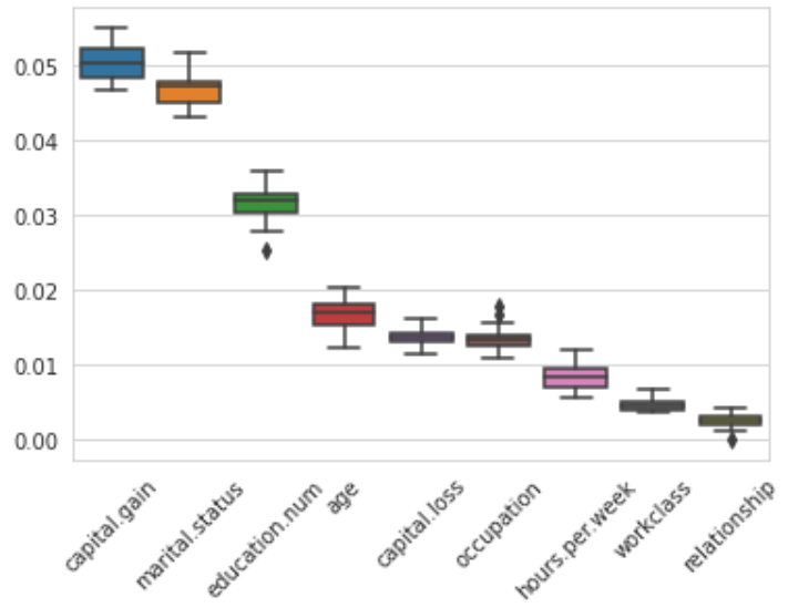 실험 데이터로 Adult Census Income 데이터를 이용합니다. 이 데이터는 평균 연봉을 나타내는 income 칼럼을 예측하는 문제로 타겟 변수 income은 평균 연봉이 오만불 이상/이하인 범주형 데이터이고 성별, 결혼여부, 국적, 직업, 교육, 자본소득 등의 feature로 구성되어 있습니다.