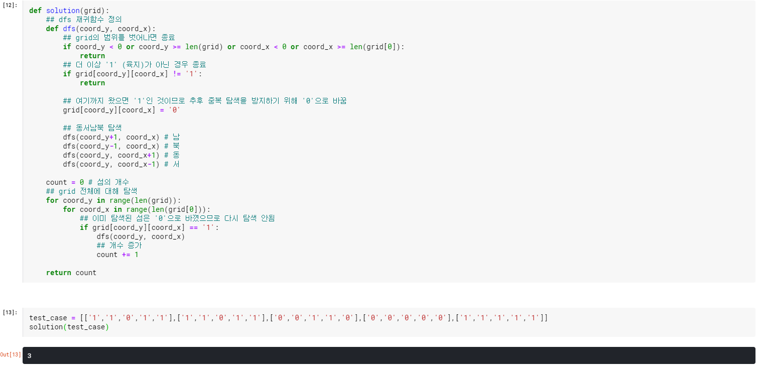 먼저 두 번의 for 루프로 입력으로 들어온 중첩리스트를 훑으면서 '1'을 발견했을 때 어떤 액션을 취해야 할 것 같습니다. 동서남북 방향으로 '1'이 연결되어야 섬의 조건을 만족하므로 (i,j) 점에서 (i+1, j), (i-1, j), (i, j+1), (i, j-1) 점을 탐색해서 그곳이 '1'이라면 다시 동서남북으로 탐색하는 재귀함수를 구성하면 될 것 같습니다.