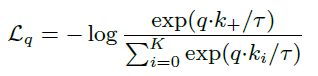 Encoded 된 query $q$와 encoded 된 키 $k_0, k_1, ...$이 있고 하나의 키 $k_+$만 $q$에 매치되는 positive key 이고 나머지 $K$개의 키는 매치되지 않는 negative key 일 때, Equation 1으로 contrastive loss를 정의할 수 있습니다.