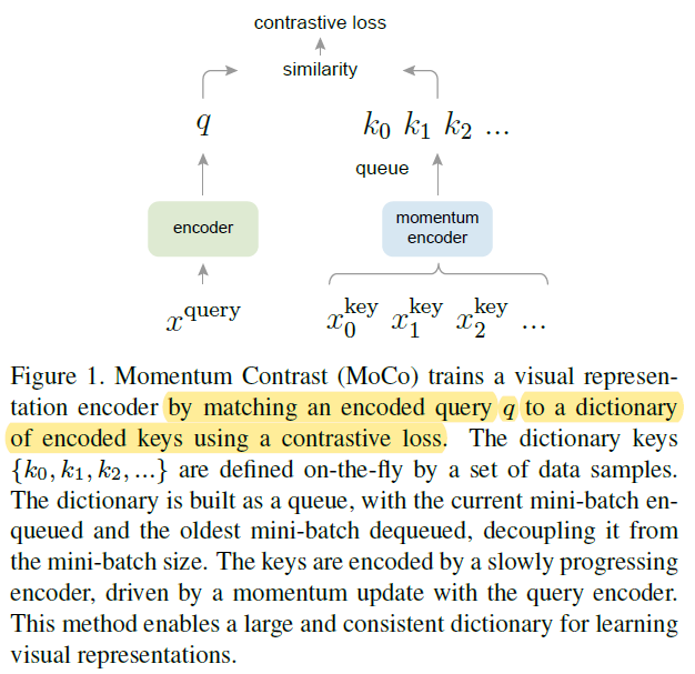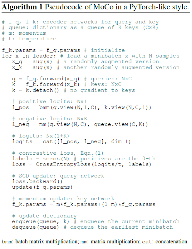 $\tau$는 temperature 하이퍼 파라미터이며, Equation 1은 1 개의 positive 샘플과 $K$ 개의 negative 샘플에 대해 $q$를 $k_+$로 softmax를 통해 분류하는 것으로 생각할 수 있습니다. 즉, 고차원의 연속된 이미지에 대해 discrete한 dictionary를 구축하여 query에 대한 positive 샘플의 분류 확률을 높이도록 훈련한다는 것이죠.