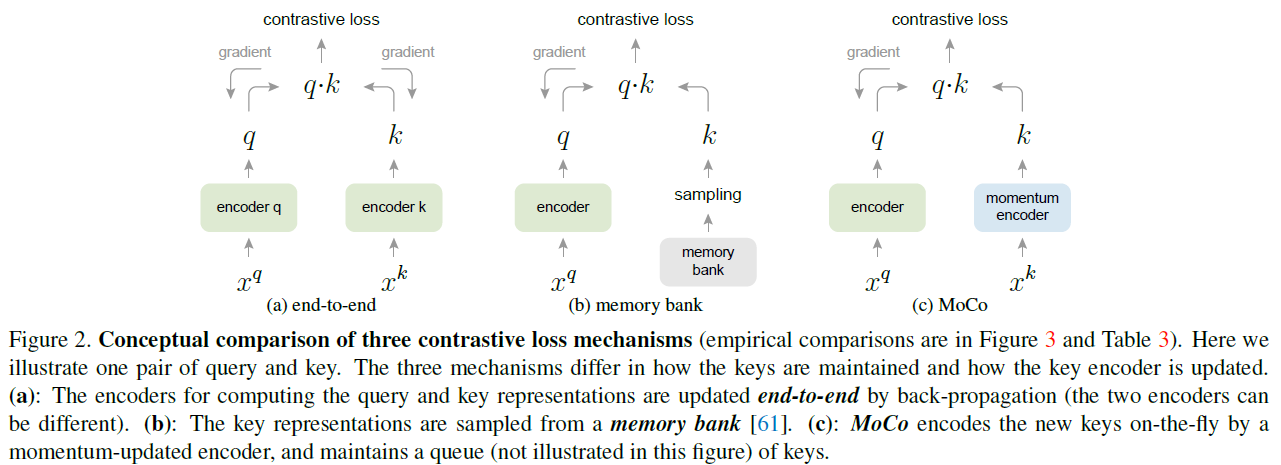 MoCo에서와 달리 기존 방법들은 1) end-to-end로 dictionary까지 back-propagation으로 업데이트하거나 2) 전체 데이터에 대한 representation을 담아 놓는 memory bank 방법으로 접근했습니다.