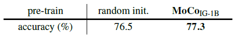 Linear evaluation 은 보통 비지도 학습으로 얻은 representation 을 고정시킨 이후에 성능을 측정합니다. 하지만 일반적으로는 전체 레이어에 대해 end-to-end 방식으로 fine-tuning 하게 되는데요. 랜덤하게 초기화된 scratch와 IG-1B 로 pre-training 한 이후의 성능을 비교했을 때 MoCo가 성능이 0.8% 더 증가했습니다.