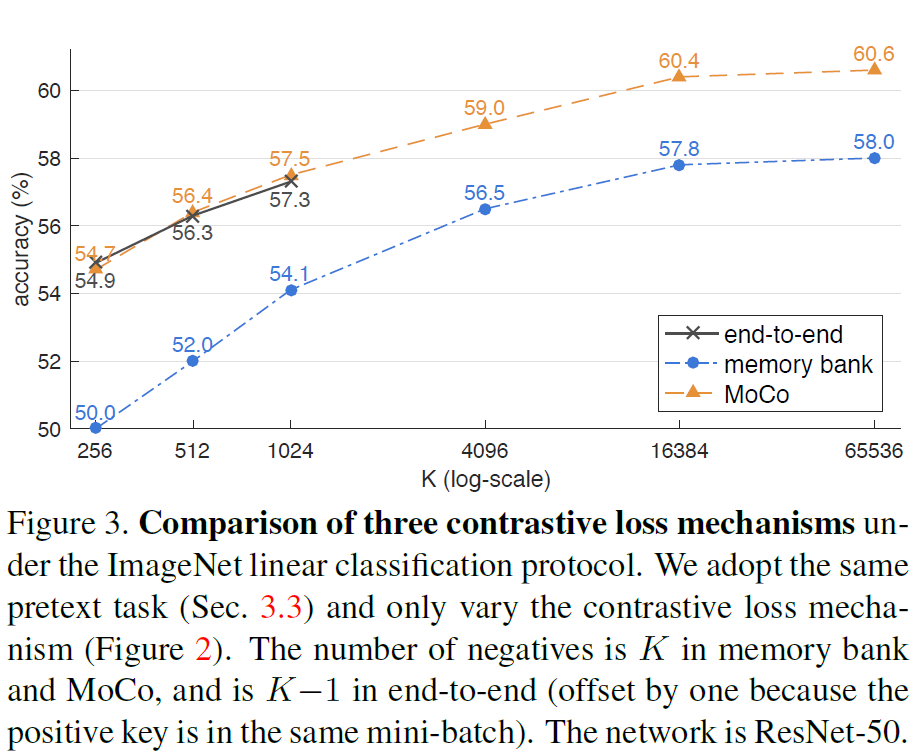 먼저 end-to-end/memory bank/MoCo 훈련 방식을 비교합니다. Figure 3을 보면 모든 메카니즘이 딕셔너리가 클수록 성능이 좋은 것을 볼 수 있습니다.