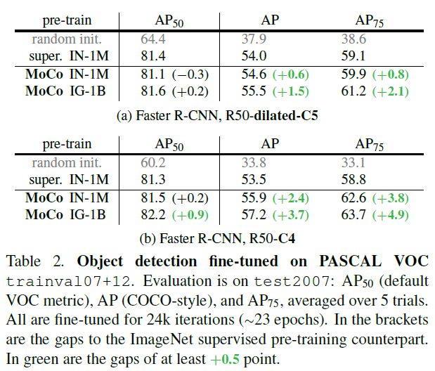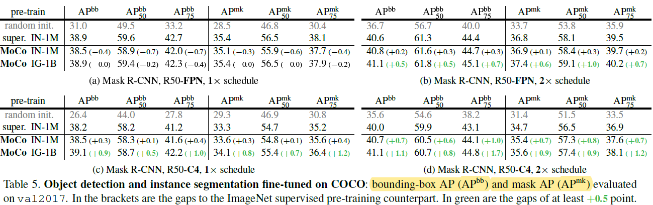 비지도 학습의 주요 목적은 학습한 feature 를 다른 object detection/segmentation 등의 다른 downstream task에 성공적으로 적용하는 것입니다. 그동안은 ImageNet을 이용한 지도 pre-training 이 주류를 이루었는데요, 이번 섹션에서는 supervised pre-training 에 비해 성능을 비교합니다. 특히, 주목할 점은 공정한 비교를 위해 MoCo와 supervised pre-training의 하이퍼 파라미터들과 훈련 스케쥴을 똑같이 설정한다는 것입니다. 이러한 세팅은 MoCo에 불리하겠지만 MoCo는 굉장히 놀라운 성능을 보여줍니다.