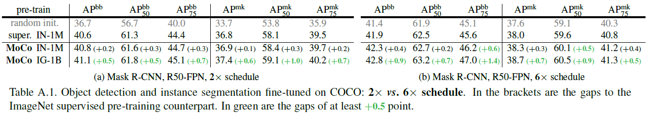 본 실험에서는 supervised baseline이 긴 훈련으로 이득이 클 것 같아 1x/2x (12/24 epochs) 정도로 fine-tuning iteration을 제한했습니다. 여기서는 6x (72 epochs) 정도로 길게 fine-tuning 시켰을 때 성능을 비교합니다. 당연하게도 모든 방법의 성능이 증가하나 MoCo 의 성능 증가가 더 큰 것을 확인할 수 있습니다.
