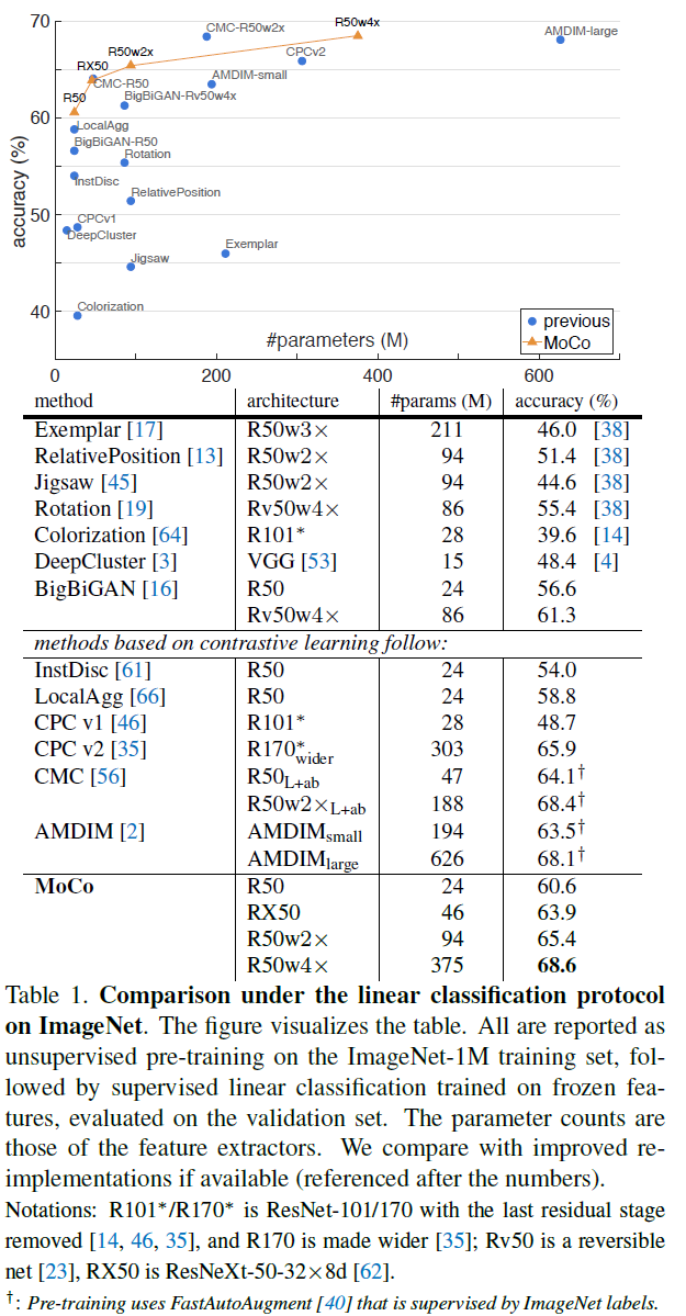 일반적인 비지도 pre-training 의 성능 측정 방법으로 고정된 representation에 fully-connected layer/softmax 로 구성된 linear classifier를 올려 놓고 지도 학습을 수행하는 linear classifier 성능 평가입니다.