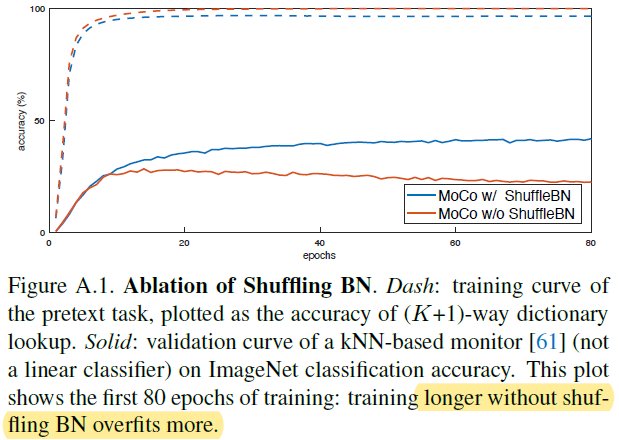 Shuffling BN이 없을 경우 1개의 positive 샘플을 구분하는 pretext task에 때해 모델이 과적합되는 현상이 발생합니다. 이는 $q$와 $k$가 동일한 sub-batch 통계를 가지고 있을 때 positive 샘플을 쉽게 구분하도록 cheating 할 수 있는 signal을 제공한다고 생각할 수 있습니다.