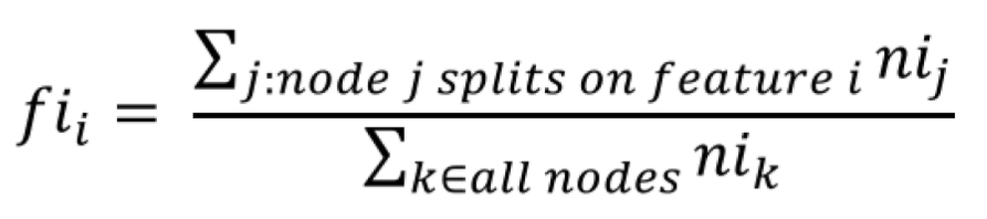 이제 $i$ 번째 feature importance $I(f_i)$를 계산할 수 있습니다. $I(f_i)$는 전체 노드의 importance gain의 총합해서 $f_i$에 의해 분기된 모든 노드의 importance gain의 비율로 정의됩니다.