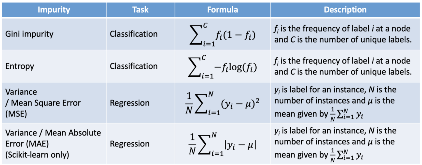 따라서 의사결정나무 훈련 시에는 노드를 분할할 때 어떠한 feature를 사용해서 어떠한 기준으로 나눌지 결정하는 것이 제일 중요한 작업입니다. 일반적으로 분류 시에는 Gini impurity라는 개념을 사용하고 회귀 시에는 mean squared error 를 사용하여 "Information Gain" 이 가장 높게끔 분기하게 됩니다..