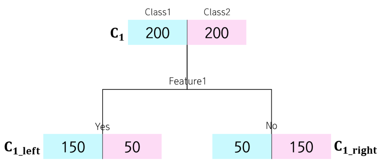 해당 노드에서 샘플들이 균등하게 분포되어 있을 경우 Gini impurity가 높아지게 됩니다. (마찬가지의 원리로 엔트로피 또한 높아집니다) 분류 시에는 이 Gini impurity 가 최대한 감소하는 방향으로 노드를 분기하게 됩니다. 다음과 같이 총 샘플이 400개인 이항 분류 문제에서 $G(C_1), G(C_{1,left}), G(C_{1,right})$ 는 다음과 같습니다.