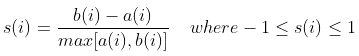 Silhoutte 계수를 정하기 위해서 특정 샘플과 그 샘플이 속한 군집의 데이터들의 평균 거리와 그 샘플이 속하지 않은 다른 군집의 모든 데이터들과의 평균 거리의 최소값을 계산합니다. 먼저 샘플 $i$와 그 객체가 속한 군집의 데이터들과의 거리를 모두 계산하여 해당 군집의 비유사성 $a(i)$을 계산합니다. Equation 1의 $g(x_i)$는 $x_i$가 속한 군집을 말하며 $d$는 거리로 Euclidean이나 Manhatten 거리를 말합니다..