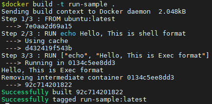 컨테이너에 FROM 명령에서 지정한 베이스 이미지에 대해 "애플리케이션/미들웨어를 설치한다"/"환경구축을 위한 명령을 실행한다" 등의 명령을 실행할 때 RUN 명령을 사용합니다. RUN 이후에 일반적인 쉘 스크립트 형식으로 명령을 기술할 수 있고 ['args1', 'args2',...] 형식으로 지정할 경우 쉘을 경유하지 않고 직접 실행합니다. 컨테이너 실행시의 디폴트 쉘은 ['bin/sh', '-c'] 형식으로 지정됩니다. 다음 명령어를 통해 도커 이미지를 빌드하면 명령이 한 줄씩 실행되면서 이미지를 생성하고 쉘 스크립트 형식은 /bin/sh 쉘로 실행되고 리스트 형식은 쉘을 통하지 않고 실행되는 것을 알 수 있습니다. 주의할 점은 리스트 형식을 통해 기입할 때 단 따옴표 ('')가 아닌 쌍 따옴표로 ("") argument를 기술해야 합니다.