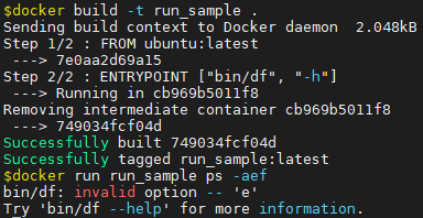 이는 ENTRYPOINT 명령으로 지정한 컨테이너 실행 명령은 컨테이너 구동 시 전달된 인자와 별개로 무조건 유지하고 전달된 인자는 CMD로 받아 처리합니다. 즉, df -h ps -aef 와 같은 명령이 되기 때문에 에러가 발생하게 됩니다.