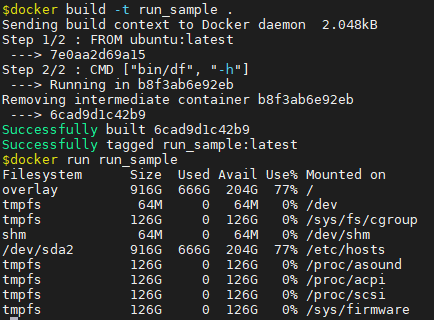 그렇다면 CMD 명령과 ENTRYPOINT 명령의 차이는 무엇일까요? 가장 큰 차이점은 컨테이너 시작 시 실행 명령에 대한 디폴트 지정 여부입니다. ENTRYPOINT 명령으로 컨테이너 시작 시의 명령을 기술한 경우 docker container run 에서 주어진 옵션과 상관없이 무조건 ENTRYPOINT 에서 지정한 명령을 우선적으로 수행합니다. 하지만 CMD 명령을 사용하여 수행할 경우 docker container run 에서 주어진 옵션이 CMD 값을 대신하여 실행하게 됩니다. 다음 dockerfile을 빌드하고 컨테이너를 실행하면 컨테이너의 파일시스템의 용량 정보가 나오게 됩니다.