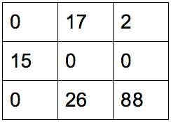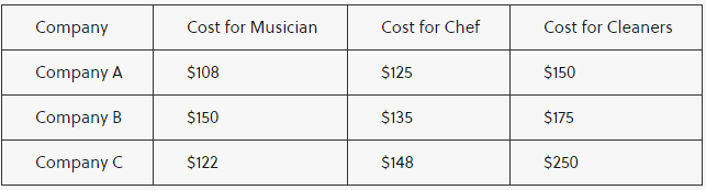 Hungarian 알고리즘은 두 개의 그래프에서 정점 간 이동할 때 발생하는 cost 를 최소화하는 문제로 한 그래프의 정점 $i$에서 다른 그래프의 정점 $j$로 갈때의 cost 테이블 $C[i,j]$를 기반으로 동작합니다. 즉, 한 그래프의 정점들은 $C$의 행으로 표현되고 다른 그래프의 정점들은 $C$의 열로 표현되면서 각 행과 열 별로 cost 합이 최소가 되는 매칭 인덱스를 찾는 것이죠. 다음과 같이 회사 3개에 따른 Musition/Chef/Cleaners 고용 비용에 대한 cost 테이블을 예로 들어보겠습니다. 하나의 회사가 셋 중 하나만을 고용할 수 있고 각 회사의 고용비를 합쳤을 때 언제 최소가 되는지 찾는 문제입니다.