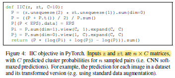 그렇다면 $x'$을 어떻게 얻을까요? IIC에서는 이미지에 대한 랜덤 tranformation $g$를 정의하여 $x'=gx$를 사용합니다. $g$는 geometric 한 scaling, skewing, rotation, flipping 이거나 contrast, color saturation 과 같은 색상 변화를 이용합니다. (원래의 $x$가 가진 정보를 손상시키지 않는 선에서 어떠한 종류의 변환이 가능합니다.) 따라서 IIC는 $x$와 변환된 $x'$에서 불변의 공통 정보 (invariant) 를 추출하도록 학습되고 이 정보가 cluster를 이루는데 사용됩니다. Pytorch 코드로는 Figure 4와 같이 간단히 구현할 수 있습니다.