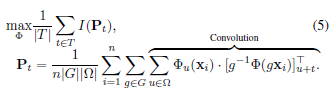 그렇다면 Equation 3의 displacement $t$에 대한 구현은 어떻게 이루어질까요? $y=\Phi(x), y'=\Phi(x')$ 에 대해서 먼저 $y'$을 $y$의 좌표로 bilinear resampler를 이용해 되돌립니다. ($y' \leftarrow g^{-1}y'$) 따라서 Equation 3의 안쪽 summation (convolution 이라 표현된 부분)은 두 개의 tensor의 convolution이 됩니다. ($P=y*y'$) 따라서 패딩 크기를 $d$라고 했을 때 $y, y' \in R^{n\times C\times H\times C}$ 이므로 $P\in [0,1]^{C\times C\times (2d+1)\times (2d+1)}$ 로 구해집니다. ($P$를 normalize 합니다.)