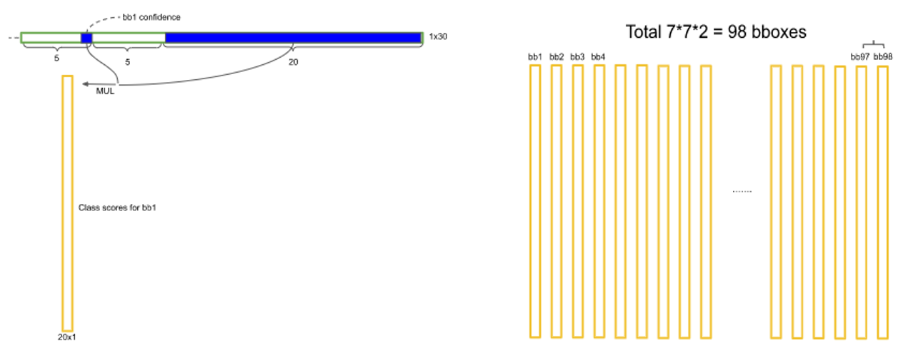 7x7x30 의 출력 텐서에서 2개의 bounding box 에 대한 예측 10개를 제외한 나머지 20개는 물체가 있을 때의 물체의 클래스를 예측하는 텐서로 ($p(obj_i | obj in box)$, 클래스의 종류는 20개라 가정합니다.) 이것과 각 bounding box 마다 존재하는 물체가 있을 확률 $p(obj in box)$ 을 곱해 해당 격자의 bounding box 의 20개 클래스에 대한 최종 class score 를 유도하고 이를 모든 격자에 대해 반복하면 입력 이미지에 존재하는 98 (49x2) 개의 bounding box 에 대한 class score를 Figure 2와 같이 유도할 수 있습니다.