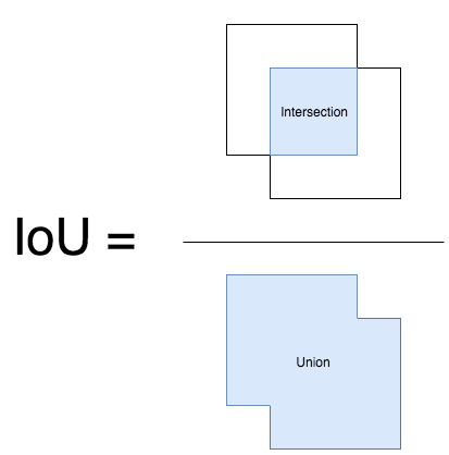 2) $D$에 추가된 class score 가 가장 높은 bounding box 와 $B$에 담긴 bounding box 와의 IOU (Intersection Over Union) 을 계산합니다. IOU는 두 개의 bounding box 가 얼마나 겹쳐져 있는지 나타내는 지표로 Figure 4와 같이 계산합니다. IOU 가 주어진 임계치 $N$보다 크다면 $B$에서 제거합니다.