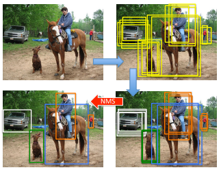 이 상태에서 각 bounding box 의 score 가 일정 임계치 이상이면 참이라고 판단하는 경우의 문제는 Figure 3과 같이 같은 물체에 대하여 많은 bounding box 가 잡힐 수가 있다는 점입니다. 따라서 object detection 에서는 한 객체에 대해 가장 신뢰도가 높은 하나의 bounding box 만 남기고 그 객체와 관련된 나머지 bounding box 를 없애는 후처리 과정이 (post-precessing) 필요한데, 이때 사용하는 알고리즘이 바로 NMS (Non-maximum Suppression) 입니다.