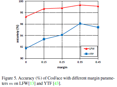 $m$에 따른 효과를 Figure 5와 같이 분석합니다. $m$이 0.45 보다 클때는 훈련에 실패했다고 하며 LFW / YTF 데이터셋에 대해 $m$에 따른 성능을 분석한 결과 $m=0.35$ 정도에서 최상의 결과를 얻었습니다.