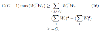 $K>2$ 경우에는 Equatino 11이 유도됩니다. $sum_{i,j, i\neq j}$의 모든 경우수는 $C(C-1)$개 이므로 Equation 11의 첫 번째 수식의 inequality 가 성립하고 지난 포스트에서의 $s$의 lower bound 증명하기 위한 과정과 비슷하게 두 번째 / 마지막 수식을 유도할 수 있습니다. 따라서 $max(W_i^T W_j) \geq \frac{-1}{C-1}$ 이므로 Equation 10의 두 번째 경우가 ($C\leq K+1$) $0\geq m \geq (1-max(W_i^T W_j)) \geq \frac{C}{C-1}$로 유도됩니다.