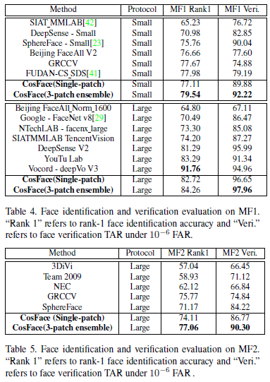 MegaFace 는 large-scale 의 얼굴 인식 성능평가 벤치마크 데이터셋으로 갤러리셋과 프로브셋으로 구성되어 있습니다. 프로브셋은 Facescrub / FGNET 데이터셋이 사용되며 보통 Facescrub 데이터셋을 (530 명의 연예인에 대한 100K개의 이미지) 프로브셋으로 사용합니다. MegaFace Challenge 1의 갤러리셋은 690K 명에 대한 Flickr 이미지 1M개로 구성되어 있고, MegaFace Challenge 2에서는 Megaface 에서 제공한 672K 명에 대한 4.7M 이미지를 훈련 데이터를 사용하며 갤러리셋은 challenge 1의 갤러리셋과는 다른 1M개의 이미지로 구성되어 있습니다. 최종 결과는 Table 4, 5와 같으며 두 방법 모두 CosFace 의 결과가 가장 좋은 것을 확인할 수 있습니다. (3-patch ensemble 은 같은 얼굴 이미지에 대해 3개의 랜덤 cropping 을 수행해 patch 를 추출하고 이 3개의 patch에 대한 feature 를 이어붙인 것으로 지난 포스트를 참고하시길 바랍니다.)