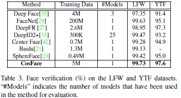SphereFace 에서처럼 LFW / YTF 에서 각각 6000 쌍 이미지, 5000쌍 비디오를 뽑아내어 face verification 성능을 평가합니다. 결과는 Table 3과 같습니다.