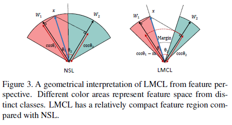 Discriminative feature 학습을 위한 cosine 마진 $m$의 최적값을 무엇일까요? 먼저 $m$을 가함으로써 얻는 decision boundary 의 변화를 알아보겠습니다. 이진 분류의 경우에 $W_i, x$는 정규화되고 $\theta_i$는 $W_i, x$와의 각도라 할때, NSL의 decision boundary 는 $cos(\theta_1)-cos(\theta_2)=0$ 이 됩니다. 즉, $W_1, W_2$의 중간 지점이 되는데요, 지난 포스트에서도 언급했듯이 마진이 아예 존재하지 않으므로 중간 지점에 존재하는 $x$에 대해서는 명확한 판단이 어렵습니다. 하지만 LMCL의 경우에는 $cos(\theta_1)-cos(\theta_2)=m$ 이므로 class 1에 속하는 $x$에 대해서 $\theta_1$은 $\theta_2$보다 매우 작아야 합니다. 따라서 $m$의 존재로 인해 inter-class variance 는 커지고 intra-class variance 는 작아지게 되는 것이죠.