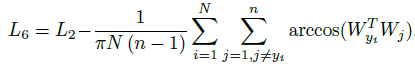 Inter-Loss 는 Intra-Loss 와 반대로 inter-class discrepancy 를 강제하므로 각 클래스 중심간의 각도를 $arccos(W_{y_i}^T W_j)$ 늘리는 함수를 Equation 6과 같이 추가합니다. $\sum_{j=1, j\neq y_i}^n$의 경우수가 $n-1$ 이므로 이를 나눠준 것을 확인할 수 있습니다.