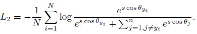 Equation 1의 softmax loss 로부터 시작합니다. $x_i \in R^{d}$에서 $d=512$ 는 feature 차원이고 $W_j \in R^{d\times n}, b_j \in R^n$ 입니다. 이후 기존 방법과 마찬가지로 $b_j=0$ 으로 두면 $W_j^T x_i = \Vert W_j\Vert \Vert x_i\Vert cos(\theta_j)$ 로 표현할 수 있고 $W_j, x$를 정규화하면 Equation 2와 같이 표현할 수 있습니다. 이때, $x$는 크기가 1이 되도록 정규화한 이후에 scale factor $s$를 다시 곱해줍니다. Feature / weight 벡터를 정규화시키는 과정을 통해 예측이 각도에만 의존하며 feature 벡터는 $s$의 크기를 가진 hypersphere 상에 위치합니다.