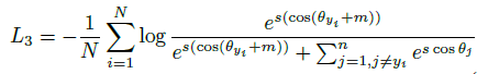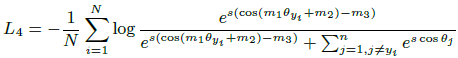 SphereFace, ArcFace, CosFace 모두 각기 다른 형태의 마진을 부가합니다. 부가되는 형태는 각각 다르나 모두 intra-class compactness / inter-class separation 을 강제하여 discriminative feature 학습을 위한 것들이죠. SphereFace, ArcFace, CosFace 마진을 각각 $m_1, m_2, m_3$ 로 했을 때, Equation 4와 같이 하나의 수식으로 표현할 수 있습니다.