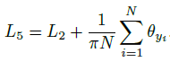 다른 loss 함수들도 feature / weight 벡터의 각도로서 표현할 수 있습니다. 마찬가지로 intra-class compactnesss / inter-class separation 을 강제하는 방식으로 loss 함수를 설계할 수 있는데요, 먼저 Intra-Loss 는 intra-class compactness 를 강제하므로 Equation 2에 feature 와 클래스 중심 사이의 각도 $\theta_{y_i}$를 줄이는 함수를 Equation 5와 같이 추가합니다.