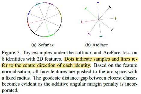이후 intra-class compactness / inter-class separation 을 위해 마진 $m$을 부여합니다. 이때, cosine 값에 마진을 부여하는 것이 아닌 각도에 마진을 더해줌으로서 geodesic 거리상에 페널티를 부여합니다. (Equation 3) 이를 additive angular margin (AAM) 페널티를 부여했다고 하며 geodesic 거리인 arc 에 페널티를 부여한 것이므로 ArcFace 라 이름짓습니다.