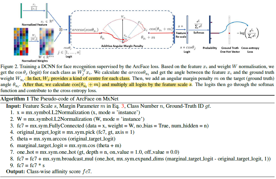 ArcFace 의 전체적인 과정과 알고리즘은 Figure 2와 같습니다. 주목할 점은 arc-cosine 함수로 $x_i, W_j$ 사이의 각도 $\theta_j$를 구한 이후 additive angular 마진을 더하고 다시 cosine 값을 더해준 이후에 $s$를 곱해 feature 크기를 조절합니다.