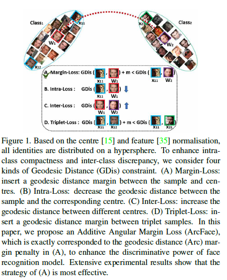 대용량 얼굴 이미지를 기반한 얼굴 인식을 위해서 같은 클래스의 feature 들이 뭉치고 (minimize intra-class variation) 다른 클래스의 feature 들이 펼쳐지는 (maximize inter-class variation) discriminative feature 학습 방법이 많이 제안되었고 대표적으로 1) softmax loss 기반의 방법들과, 2) triplet loss 기반의 방법론이 있습니다. (Figure 1에서의 geodesic 거리란 일반적으로 공간 상에서 가장 짧 표면 거리를 말합니다. 쉽게 예를 들면 지구라는 구 위에서 서울-뉴욕사이의 geodesic 거리는 지구 표면상에서 서울-뉴욕의 최단거리가 되는 것이죠. )