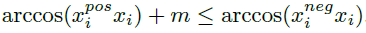 Triplet-Loss 는 triplet 데이터를 구성하는 샘플들간의 각도를 늘리는 것이 목적이므로 정규화된 feature 간의 각도에 마진을 부가합니다. 따라서 $x_i$가 $x_i^{pos}$와의 각도가 마진만큼 더 가까워지도록 Equation 7과 같이 표현할 수 있습니다.