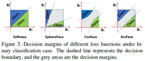그렇다면 마진이 부가되는 형태에 따라 hypersphere 상의 feature 분포는 어떻게 달라질까요? Figure 5는 이진 분류에 대한 각 loss 의 decision boundary 를 나타내는데 ArcFace 만이 각도에 따라 일관된 마진을 가짐을 알 수 있습니다.