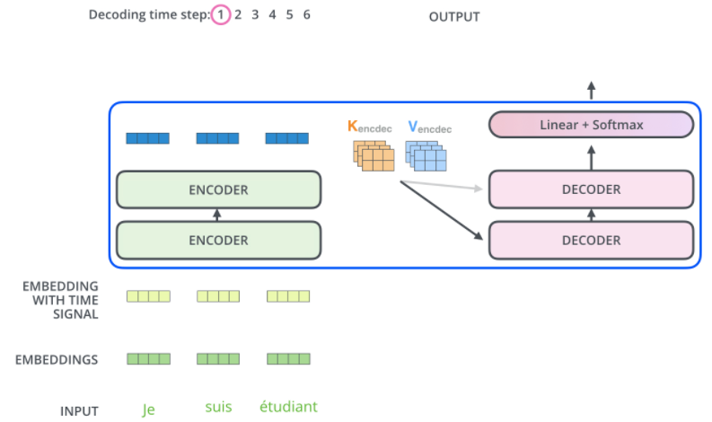 Decoder 가 동작을 수행하기 위해서는 Figure 14와 같이 encoder 가 먼저 입력 시퀀스를 처리하고 decoder 에 전달하기 위한 $K, V$ 를 생성해야 합니다. Encoder 로부터 추출된 입력 시퀀스의 representation $K, V$는 decoder layer 의 encoder-decoder attention sublayer 에 전달됩니다.