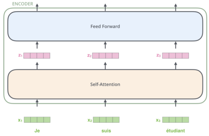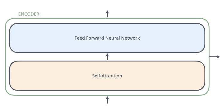 Encoder 는 입력 문장을 받아 이를 각 위치에 따른 representation 으로 표현합니다. 모두 같은 구조를 가지고 있으며 파라미터를 공유하지 않습니다. 개별적인 encoder 는 Figure 3과 같이 1) self-attention, 2) feed-forward 두 개의 sublayer 로 구성되어 있습니다. Self-attention 은 입력으로 들어온 시퀀스에 대해 각 위치의 벡터가 다른 위치의 벡터와 어떠한 관계를 가지는지 모델링합니다. Self-attention 이후에는 각 위치별로 똑같은 feed-forward network 가 적용됩니다.