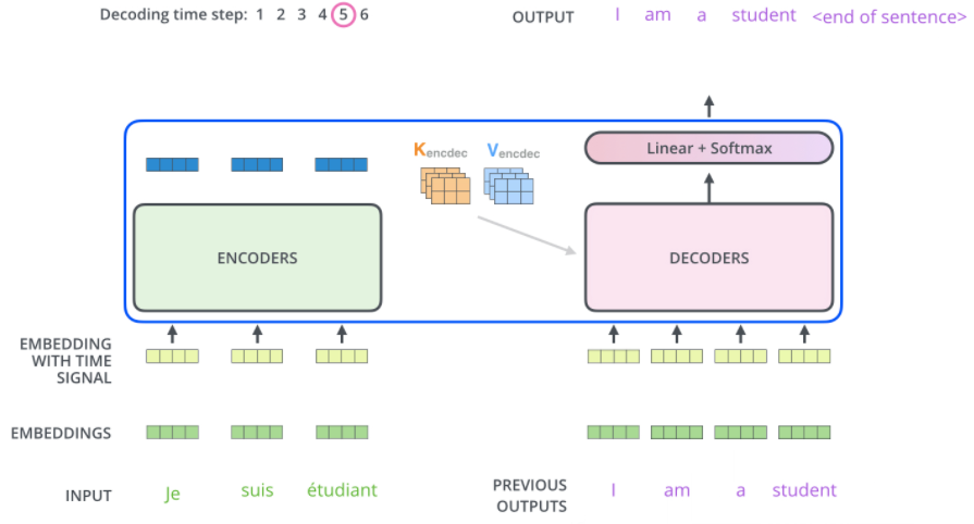 이후에는 Figure 15와 같이 decoder 가 매 스텝마다 출력을 생성하고 출력을 완료했다는 신호인 <end of sentence> 심볼이 출력될때까지 반복됩니다. 중요한 점은 Figure 15에서는 decoder 에 들어가는 출력 시퀀스와 최종 아웃풋의 순서가 같게 나와있지만 현재 스텝의 아웃풋이 다음 스텝의 입력으로 들어가므로 decoder 의 입력은 한 칸씩 오른쪽으로 shift 된 값이 들어가게 됩니다. (Figure 12의 shifted right) 또한, 위에서도 언급했듯이 현재 위치에서 이전 위치에 대해서만 attention 을 수행해야 하므로 현재 이후의 위치에 대해서는 dot product 결과에 $-\infty$를 가해주는 마스킹을 수행합니다.