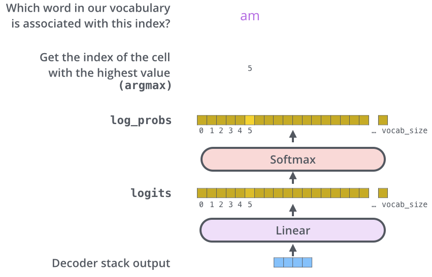 입력과 출력 시퀀스를 $d_{model}$ 차원을 가진 벡터로 변환하기 위해 임베딩을 수행하며 입력, 출력 시퀀스에 대해 같은 임베딩 행렬을 사용합니다. 또한, 출력 시에는 최종 결과물의 벡터를 우리가 아는 단어로 변환시켜야 하는데 Figure 13과 같이 각 위치마다 vocabulariy 사이즈만큼 선형변환 후 softmax 를 사용하며 각 위치마다 동일한 선형 파라미터를 사용합니다.