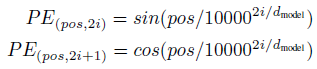 Transformer 에서는 recurrence, convolution 이 존재하지 않기 때문에 시퀀스의 각 위치의 순서를 알려주는 positional 정보가 필요합니다. 따라서 임베딩 이후에 positional encoding 벡터를 더해줌으로써 모델이 각 단어의 위치와 시퀀스 내의 다른 단어 간의 위치 차이에 따른 정보를 알 수 있게 해줍니다. Positional encoding 은 마찬가지로 $d_{model}$ 차원의 벡터이며 Transformer 에서는 Equation 2와 같은 사인, 코사인 함수를 사용합니다.