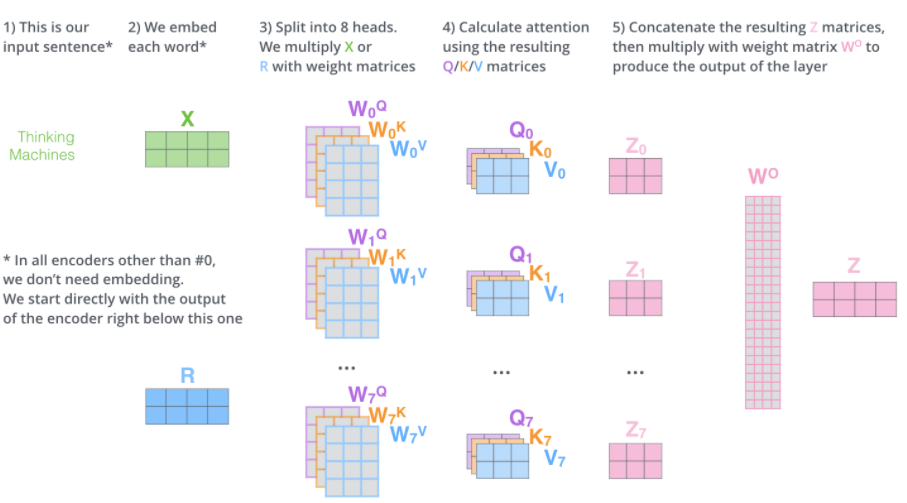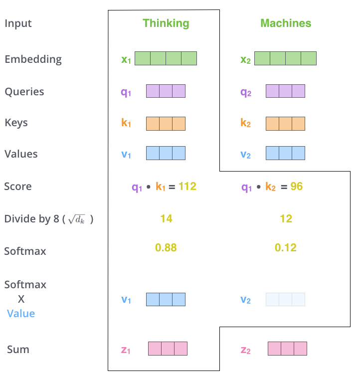 그렇다면 self-attention 이 어떠한 과정을 통해 연산되는지 파악해 보겠습니다. 먼저 attention 을 위해 query/key/value 3가지 벡터가 필요하며 입력 $x$로부터 query/key/value 를 $W^Q\in R^{d_{model}\times d_k}, W^K\in R^{d_{model}\times d_k}, W^V\in R^{d_{model}\times d_v}$ 와의 행렬 곱으로 구합니다. $d_k, d_v$는 추후 multi-head attention 을 위해 head 개수 $h=8$ 을 $d_{model}=512$ 에서 나눠준 64를 사용합니다.