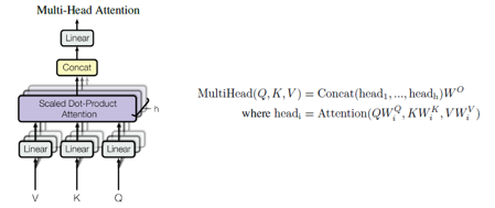 Transformer 에서는 단순히 하나의 attention 을 수행하는 것이 아닌 $h=8$ 번만큼의 attention 을 독립적으로 수행하는 multi-head attention 을 사용합니다. 각 head 별로 $W^Q, W^V, W^K$가 존재하여 Figure 9와 같이 병렬적으로 attention 을 수행하는 것이죠. Figure 9와 같이 각 head 별로 추출된 $d_v$ 벡터를 이어붙이고 (concat) 이를 $W^O \in R^{hd_v \times d_{model}}$ 에 곱한 값을 self-attention sublayer 의 최종 결과값으로 사용합니다.