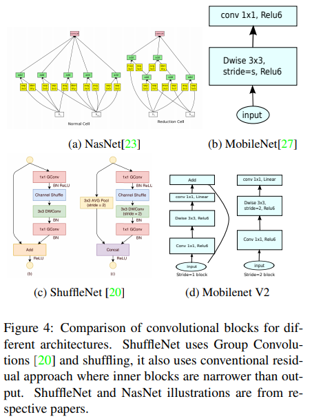 ShuffleNet, MobileNet V1 등의 다른 경량화 모델과의 비교는 Figure 4와 같습니다. ShuffleNet 은 point-wise group convolution 과 channel shuffling 을 사용하지만 일반적인 residual block 과 마찬가지로 block 의 가운데가 바깥보다 더 얇은 구조를 취합니다.
